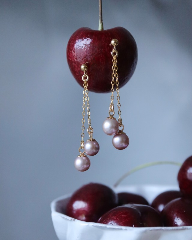【通常販売...4月末発送】 販売開始:3月27日(土)21:00- まるで木の実のように可愛らしく 可憐なピンクパープル真珠を 春のチェリーに見立てた 耳飾りをお作りしました。 ころっと真珠がチェリーのように揺れるさまが とてもキュートなお品です。 贅沢に天然カラーの真珠を4粒纏っております✿ 淡水真珠はほんのりパープルやグレージュがまざった、落ち着いたピンクとなっております。 可愛いに寄りすぎず、大人の女性も楽しんでいただける、ちょうどよい可憐さです。 真珠は天然色のため ”全く同じ色味”はございません。 ややパープルみのつよいもの グレージュがやわらかく出ているもの ピンクよりのものなど 一粒一粒に個性がございます。 いつもは左右なるべく近いカラーで組んでおりますがCherryはあえて濃淡がまざるように それぞれ異なる色味の4粒を組み合わせて お作りしました。 果物も、全くおなじ色形が存在しないように それぞれの粒たちが可愛らしく遊ぶ様子を 楽しんでいただけますと嬉しいです✿ 【金具】 ・ピアス…14kgf ・日本製無痛イヤリング…シルバー925+金メッキ 【サイズ】 ・全長…約4cm ・真珠粒…6.5mm ・重さ…片耳2g とても軽やかな耳飾りです。 【真珠につきまして】 今回、Cherryに使わせていただいた真珠たちを 葉っぱのスコップに入れて撮影したお写真を掲載しております。 この程度、それぞれの粒に濃淡の個性がございます。 4粒なるべく濃淡が可愛らしく分かれるように 作家の選別により組ませていただくことにご了承ください。 また、真珠には小さなえくぼや僅かなスレがある場合がございます。 艶照りのよい真珠ですので「1m目元から離すとほとんど判別ができない」程度の、0.5㎜以下の白く小さなえくぼは光で飛ぶため 普段使いには問題ないと判断して使用させていただいております。 その際は正面からは見えにくい内側に配置させていただきます。 当店の基準をご理解いただける方のみご購入くださいませ。 【発送】 4月下旬 (先行販売のみ3月内の発送です) ※お写真で全体の雰囲気をご確認していただくために他のアクセサリーも一緒に掲載しておりまが、こちらは【Cherry″単品”】ページなのでご注意ください。 ※複数回別々にご購入された場合は、おまとめして発送させていただきます。 プレゼント用の方への商品が含まれる場合、個別包装させていただきますのでお知らせください。 複数回に分けて購入後に、あとからの送料おまとめは、BASEのシステム上できないためご容赦くださいませ。 ※香りを添えてお送りしております。香料が苦手な方は、遠慮なく備考欄やお問合せからお知らせくださいませ。ご購入後のご連絡でも構いませんのでお知らせください。 ※輸送中の破損や絡まり等、100%ゼロにすることができません。 初期不良が発生した場合は必ず対応させていただきますので あらかじめご理解いただけますと幸いです。 ――商品ご購入前に、必ず【shopping guide】をご一読くださいーー