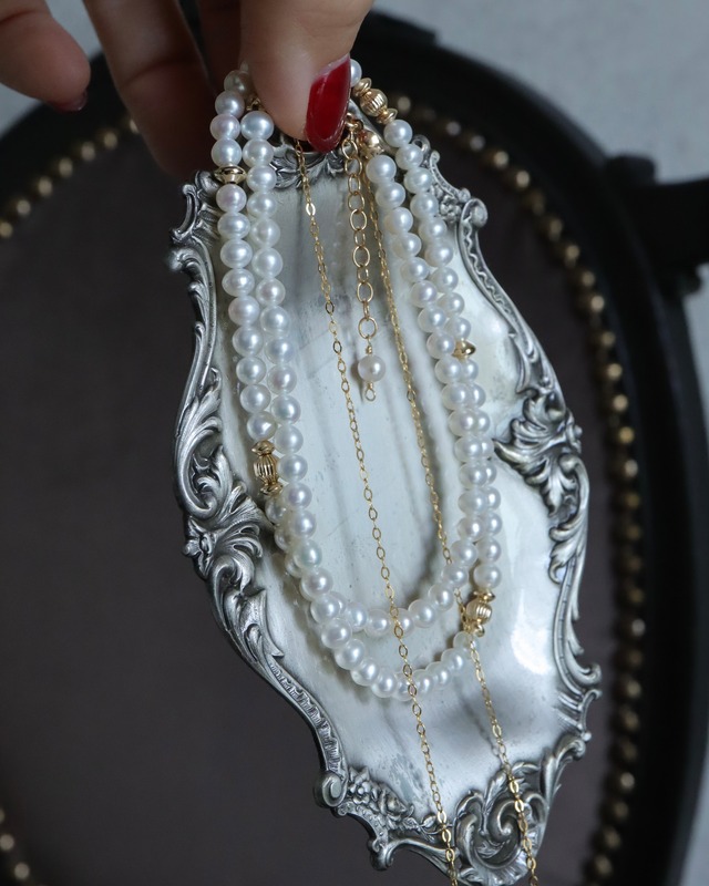 艶の美しい小粒ホワイト真珠と 輝きの美しい14kgfゴールドフィルドビーズを紡いだ エレガントな一本。 ゴールドとホワイトのみのクラシカルな印象ですが パールのサイズが4㎜と小粒のため重すぎず ざっくりとしたニットやトップスにも合わせやすいデザインに仕上げました。 シンプルなお洋服にこちらを一本取り入れてあげるだけで コーディネートが上品かつ華やかになります。 合わせやすさ、ちょうどよいクラシカル感、 軽い付け心地… すべてにおいて魅力的なのが小粒パール。 その魅力を味わっていただけますように…♡ 【種類】 タイプは3種類 ・プレーン (チェーンなし) ・14kgfチェーンドッキングタイプ(+2500) ・14kgfチェーン別タイプ チェーン長さ40-45㎝(+3500) チェーン長さ45-50㎝(+4000) エレガンスに合わせてしっかりたゆっと 14kgfチェーンを見せたい場合、 長さは「ロング 45-50cm」がおすすめです。 ※プレーンタイプは14kgfチェーンは付属しません。ご注意くださいませ。 重ね付け14kgfがあると モダンさと華やかさが一気に増します°˖✧ 14kgfチェーンは特別価格でのお届けですので この機会にご検討くださいませ。 【サイズ】 パール部分:40㎝-45㎝(5センチのアジャスター付き) 【素材】 ・淡水真珠 ・14kgf 【1月・2月の販売会でeleganceをご購入くださった方へ】 再販にあたり、同じ真珠会社様、同じ価格で小粒パールを仕入れましたが、ロットが違うことで初販時とくらべて真珠粒が0.3㎜ほど小さめです。わずかな違いをご理解くださいませ。 【発送】 発送目安:3週間 いつも到着までお待ちくださり、本当にありがとうございます✿ 【注意点】 ・こちらは【White elegance】単品のページです。 着画に使用している耳飾りは付属しませんのでご注意ください。 ・プレーンタイプには14kgfチェーンは付属しません ご留意ください。 ・真珠は照り艶を第一に選別しております。 目を凝らさないと見えないほどの白いえくぼやスレを許容させていただいております。 選別基準:1m目から離すと見えない僅かな白いえくぼ・スレは許容 自然が生み出した美しさをお楽しみください°˖✧ ・発送時、香りを添えてお届けしております。 香料が苦手なお客様は「備考欄」にご記入くださいませ。