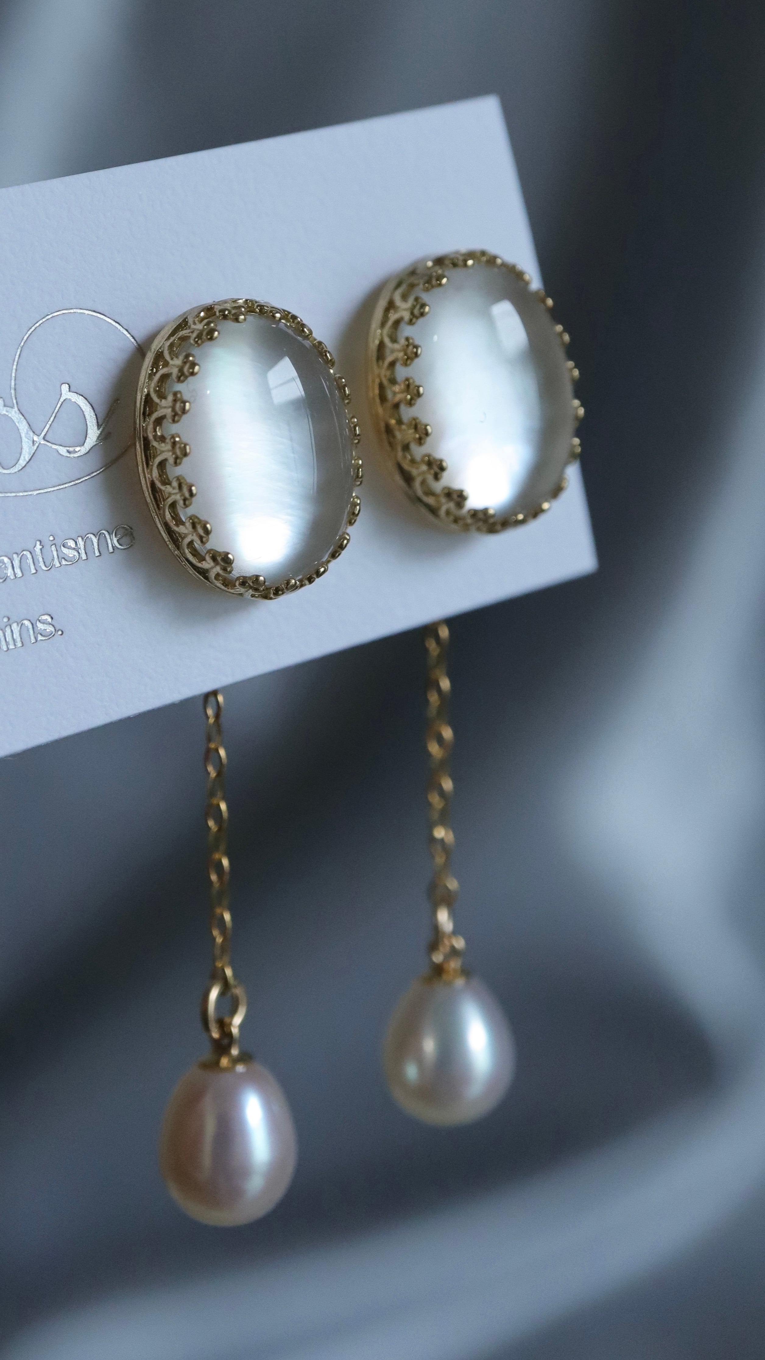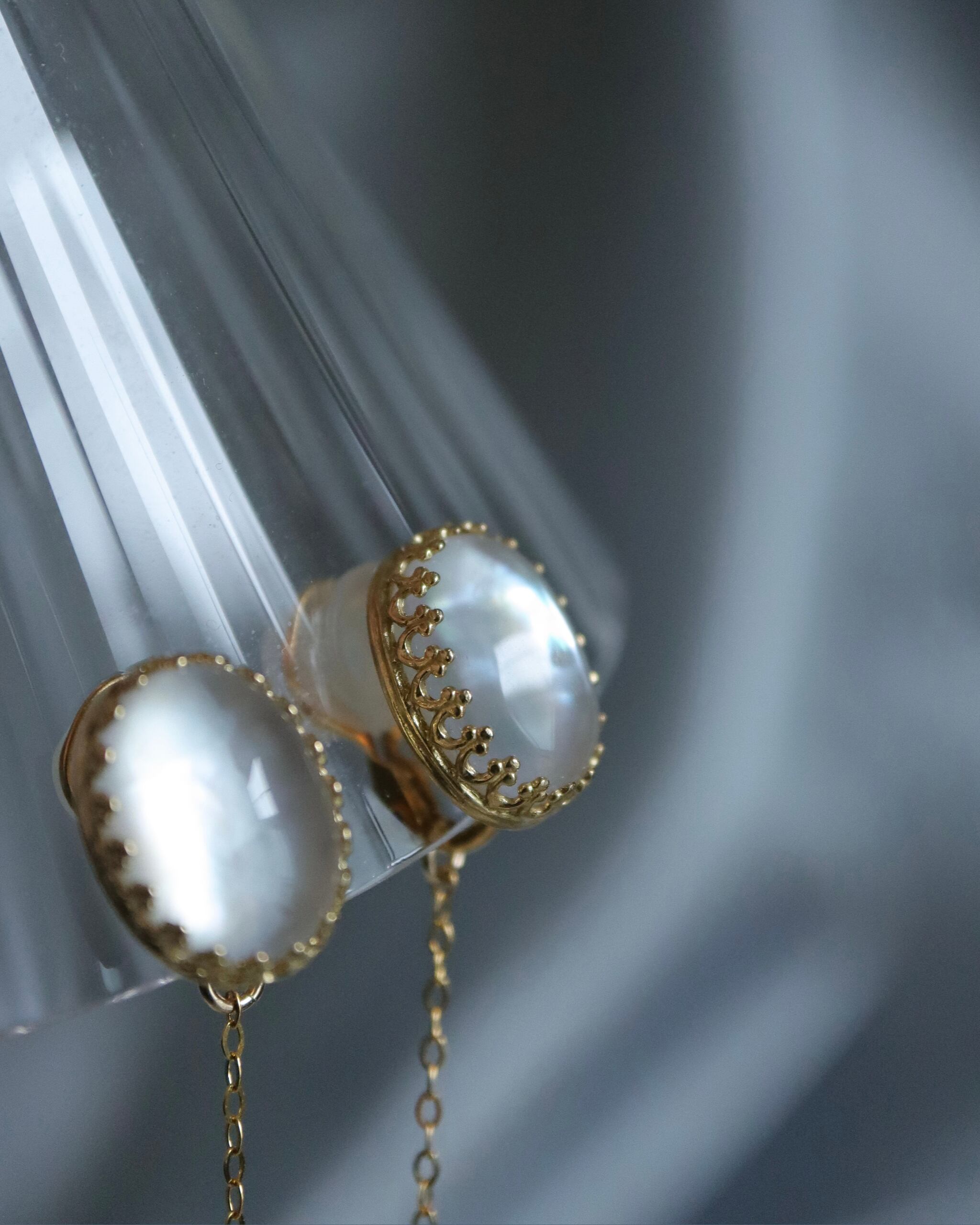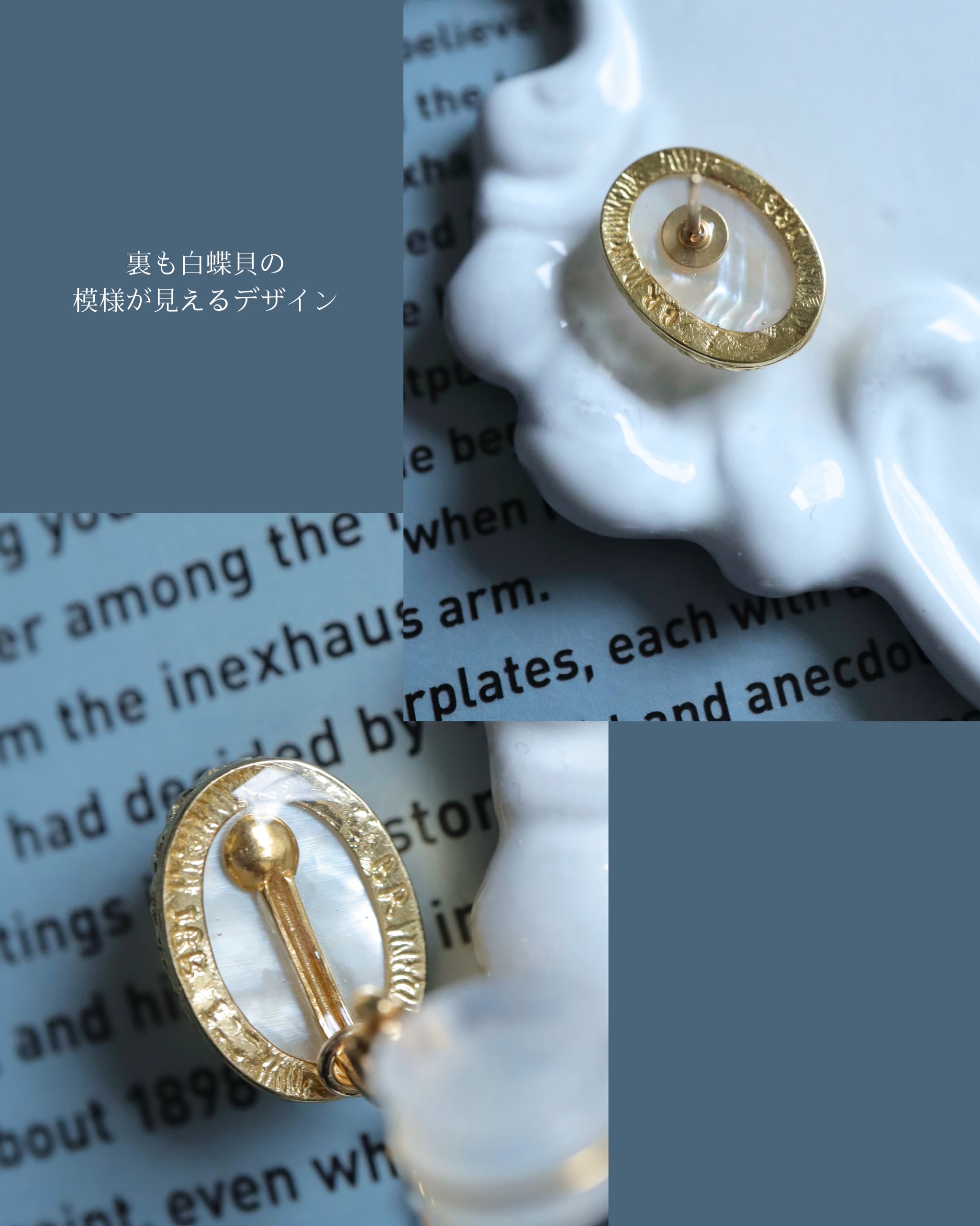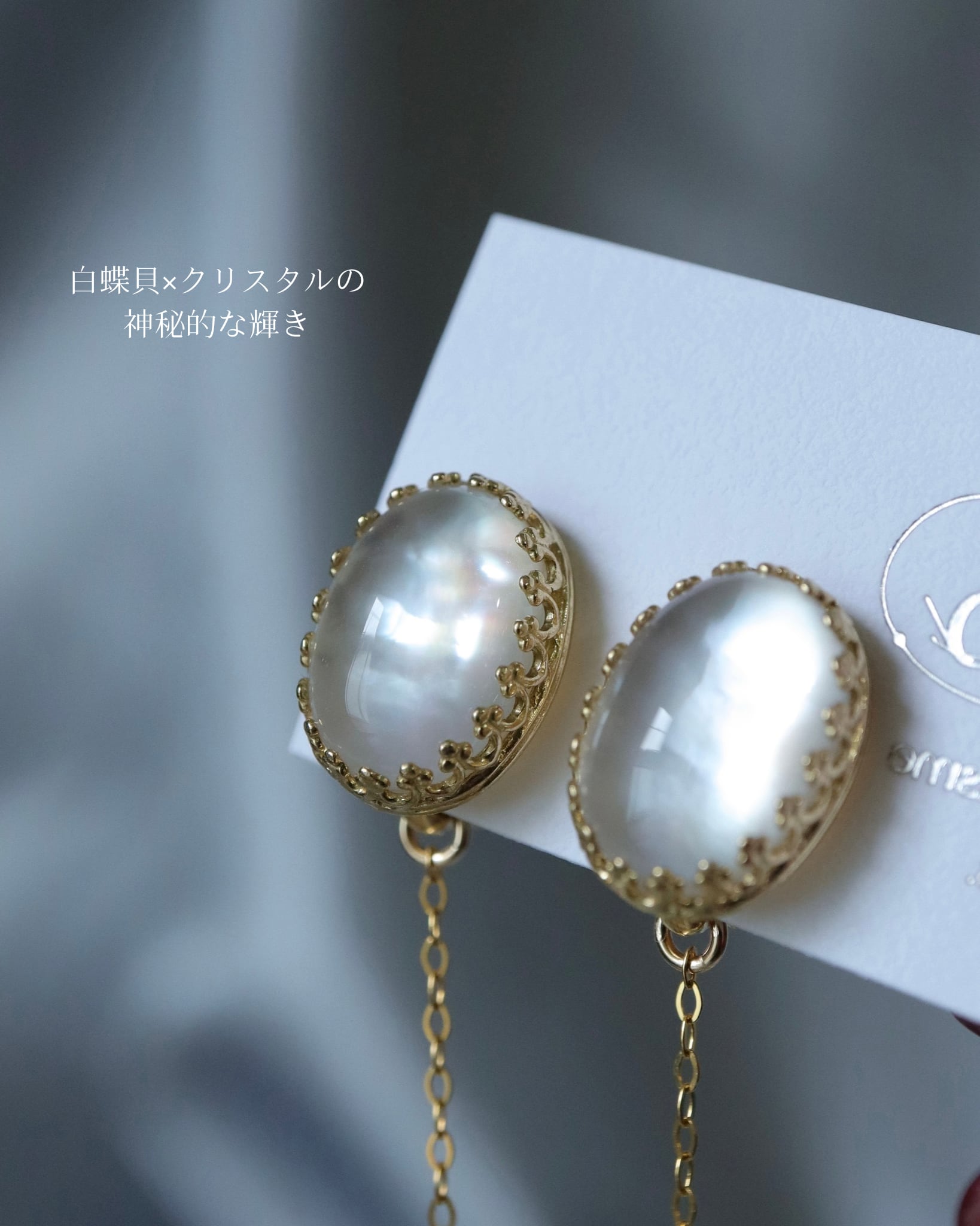 本品は、そのマザーオブパールの上に、クリスタルが被せられた特殊な加工をされたストーンを使っております。マザーオブパール特有の模様が、クリスタルによってさらに美しく輝きます。