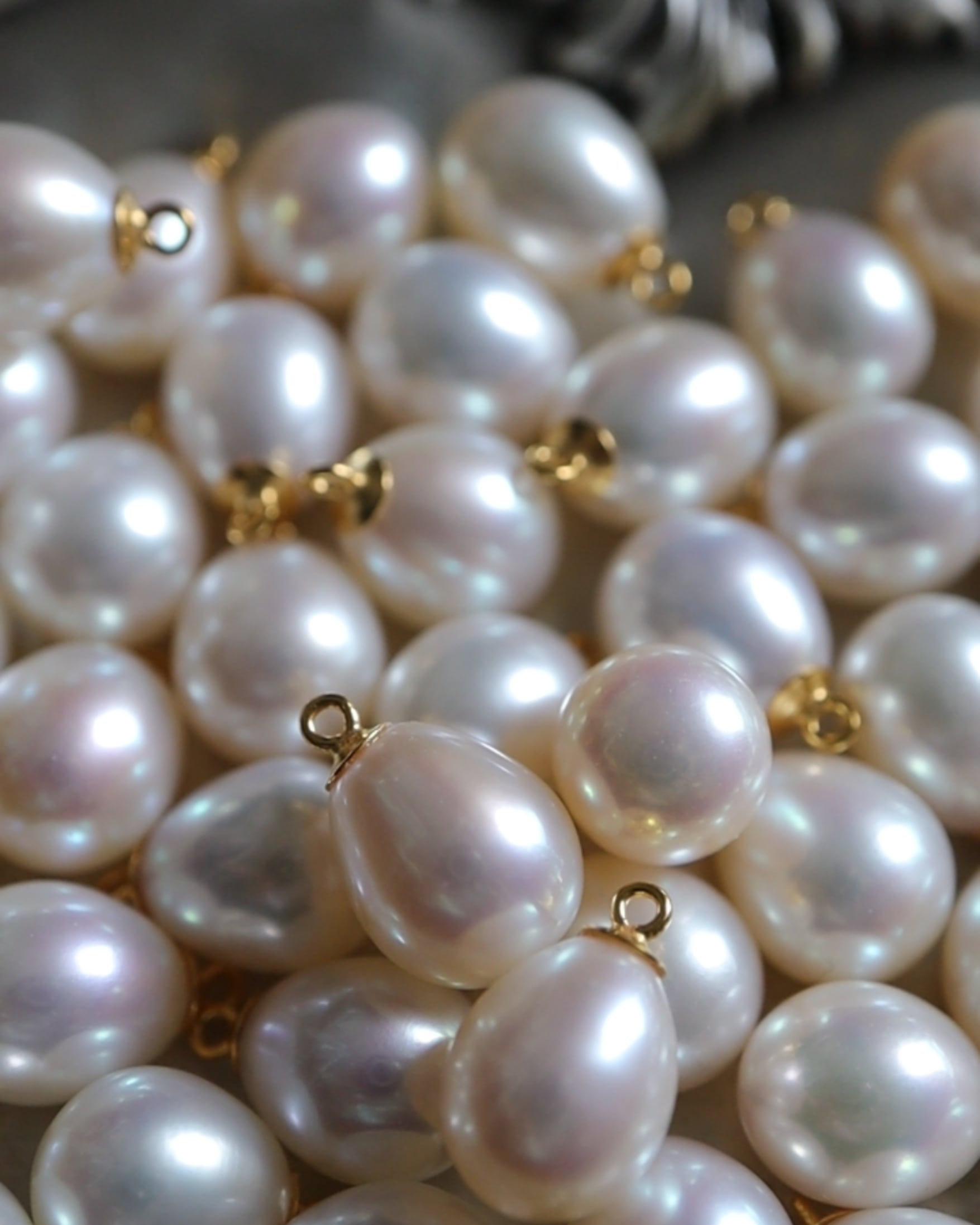 真珠の粒をぎゅっと撮影したお写真を掲載しております。ピンクみが少し強くでているもの、横にふっくらとしたものなど、それぞれ粒ごとに若干の違いがあることをピンチアップご確認ください。