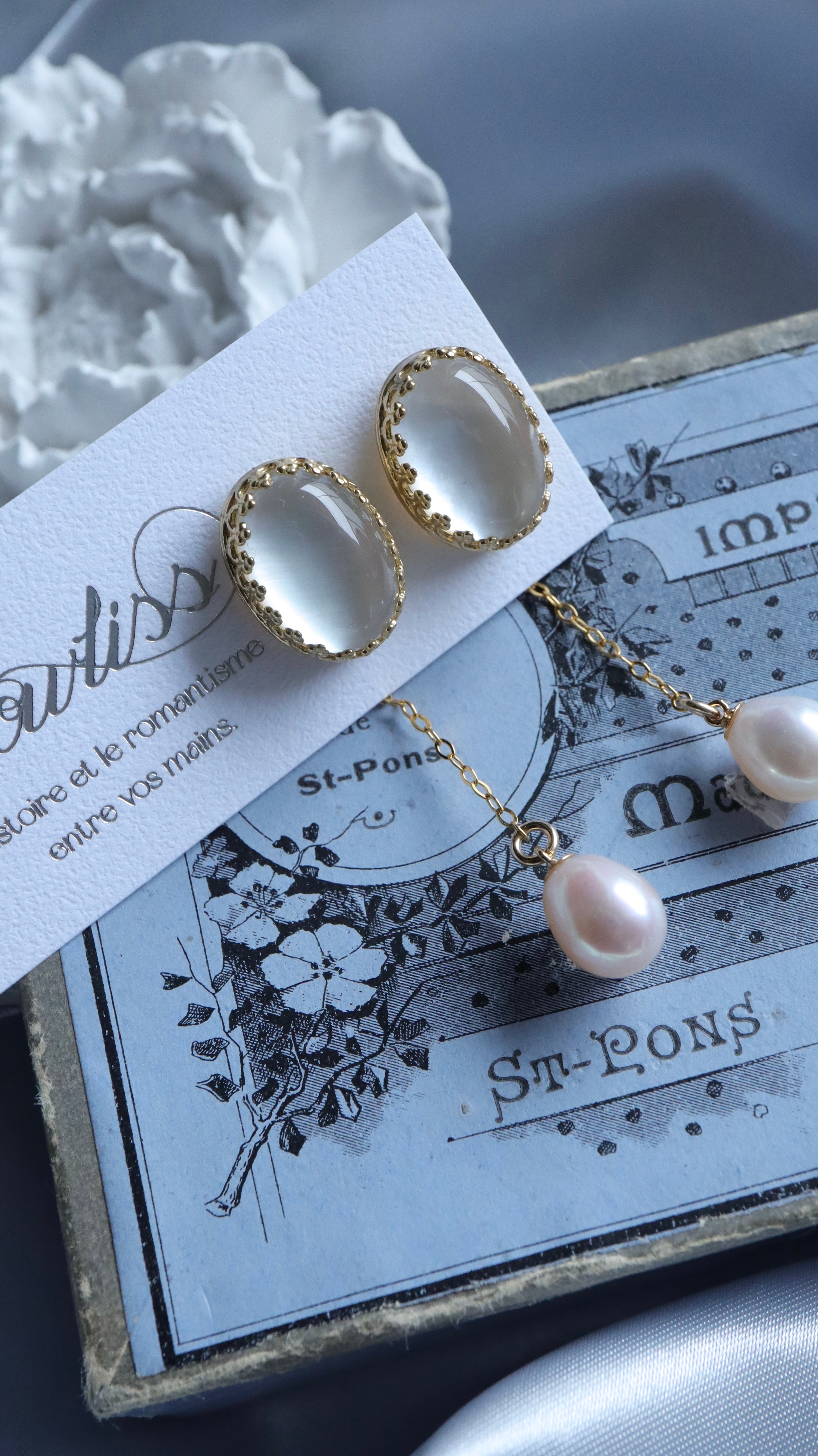 オーバルシェイプのカボションと、白真珠、