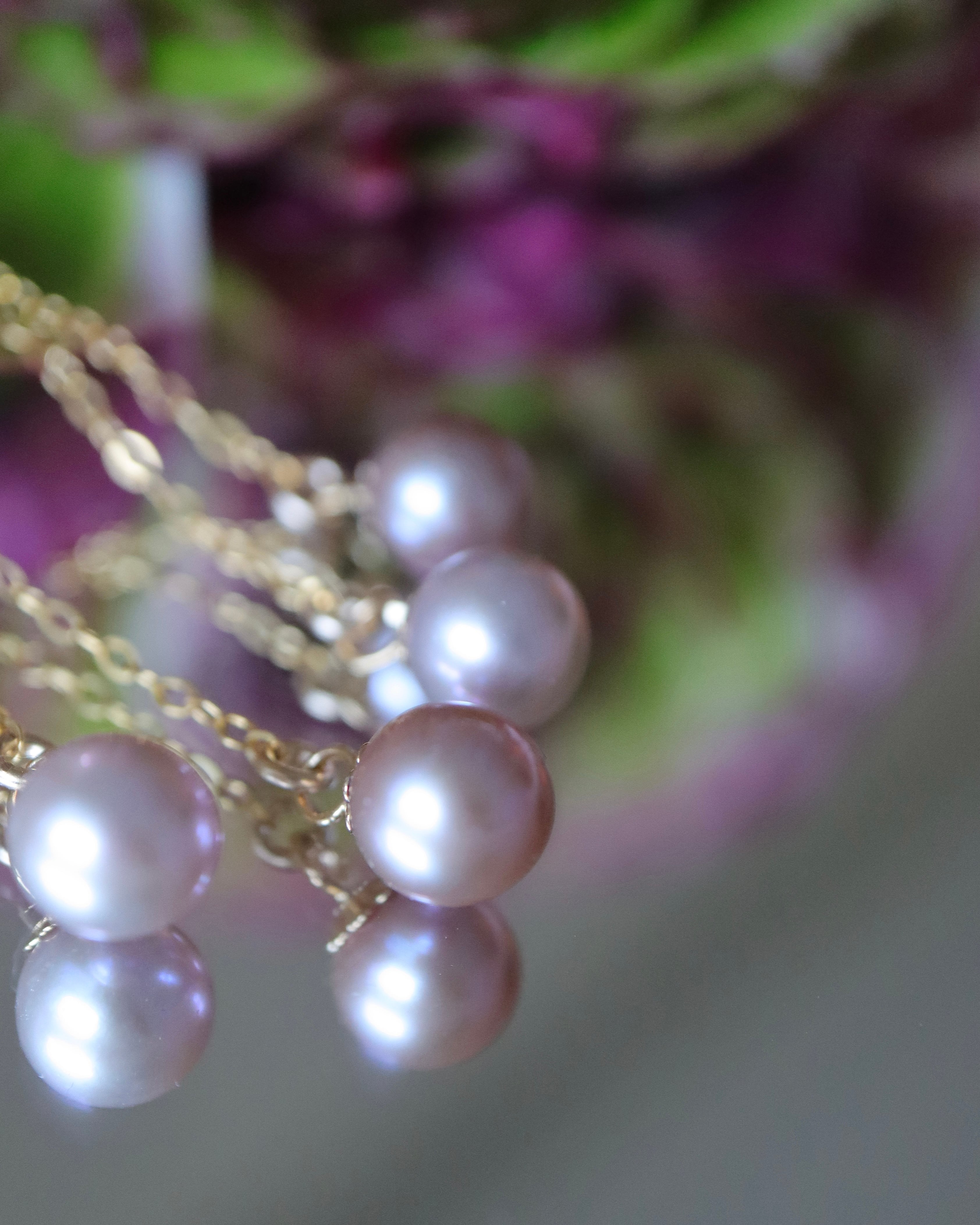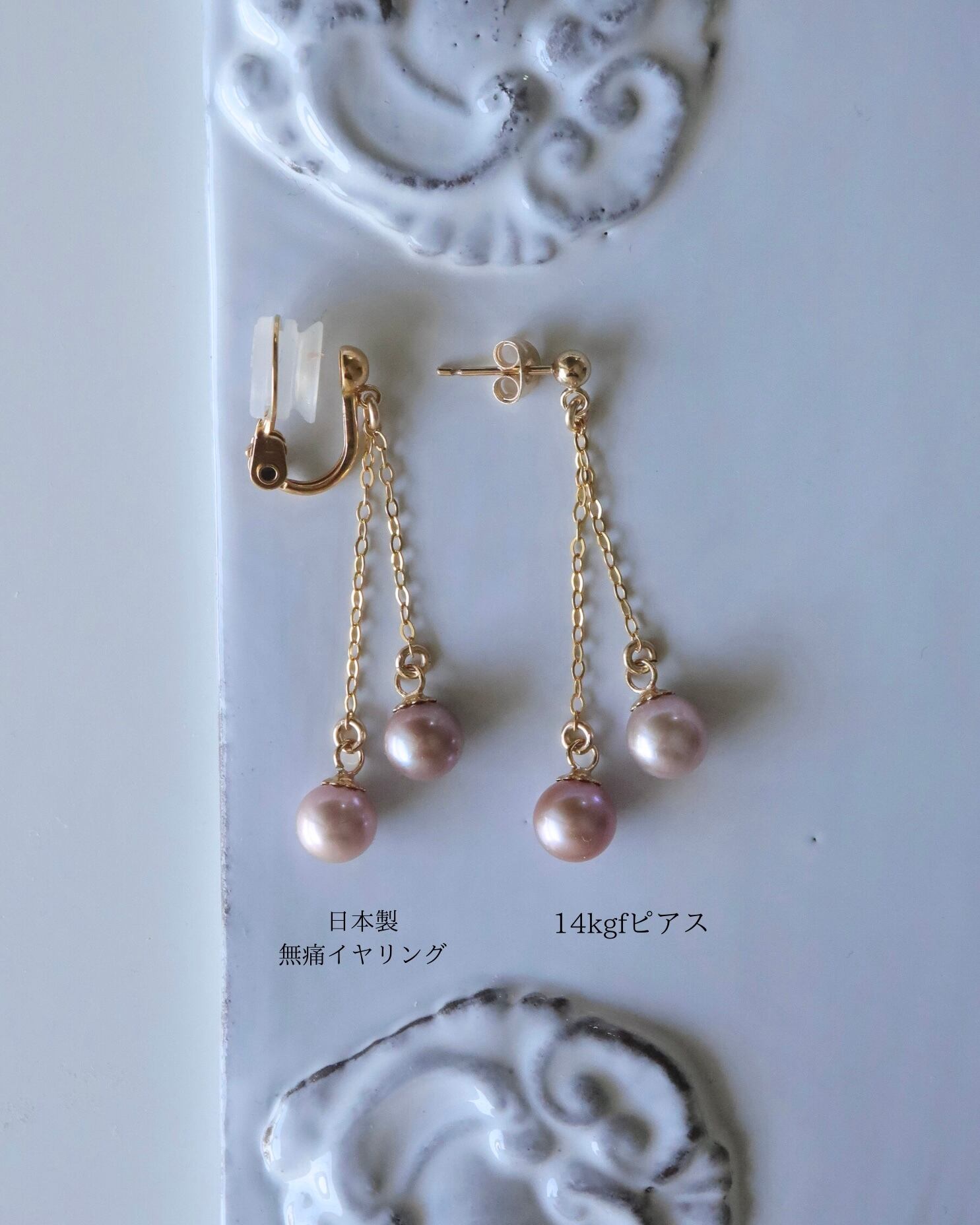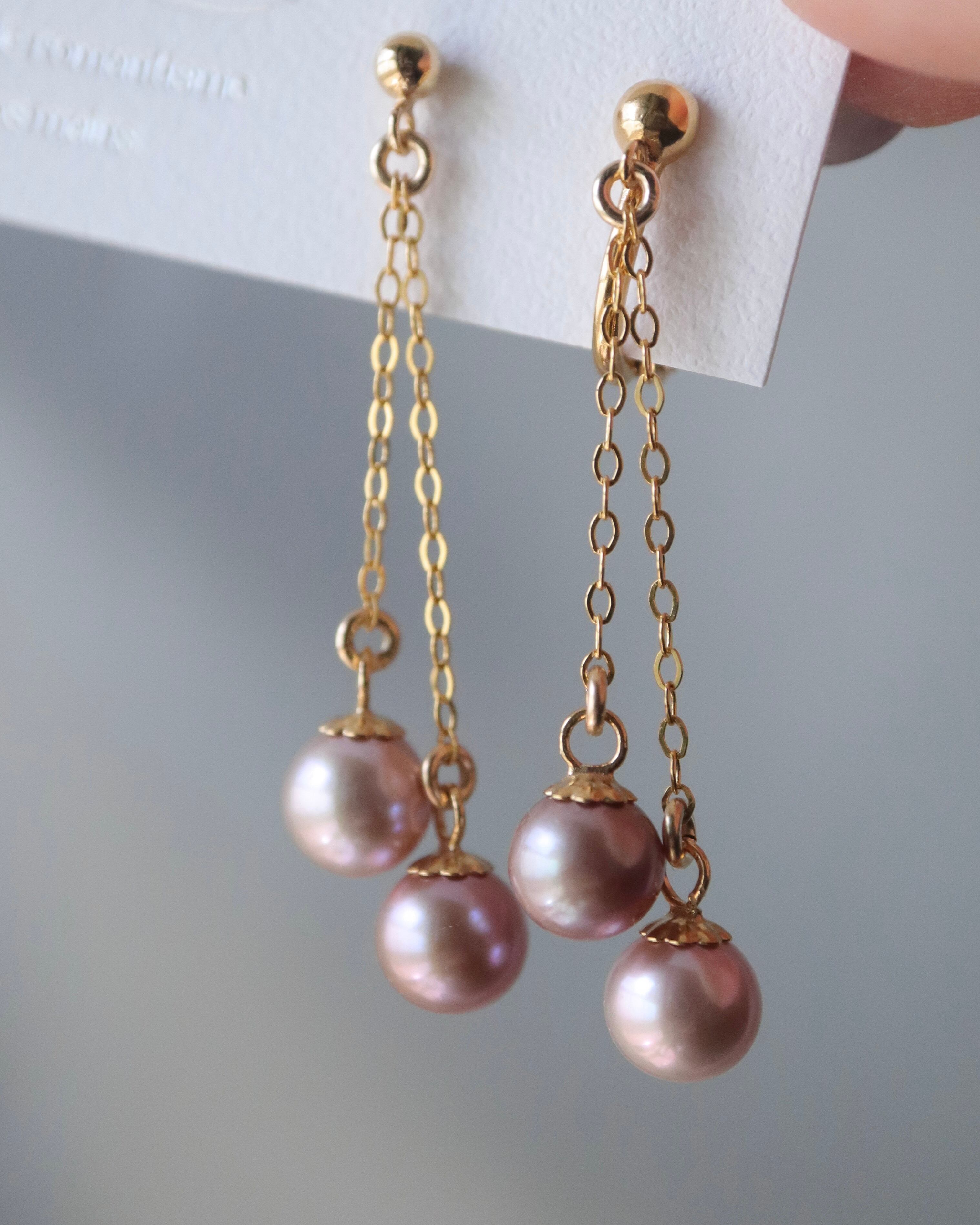 淡水真珠はほんのりパープルやグレージュがまざった、落ち着いたピンクとなっております。